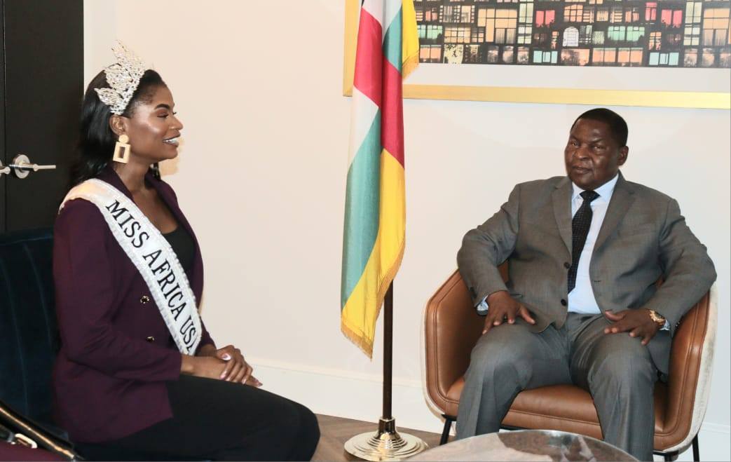Le Président centrafricain Faustin-Archange Touadéra a rencontré Diana-Melissa Ngoumape, Miss Africa USA 2025, à New York le 23 septembre 2025. Lauréate de ce concours continental et ancienne Miss Francophone 2021 (Ghana), elle a présenté un projet jeunesse axé sur l’autonomisation économique et l’éducation civique, en parfaite adéquation avec la politique présidentielle. Le Chef de l’État a salué sa maturité et sa vision, soulignant le rôle clé de la relève dans le développement national. Ambassadrice culturelle, Ngoumape incarne une Centrafrique dynamique, unissant tradition et modernité sur la scène internationale.